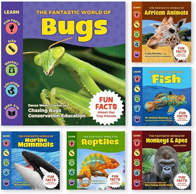 We love this bundle of six books written by wildlife experts. It features reptiles, bugs, monkeys, and more! The books are paperback and include beautiful photos and fascinating facts on habitat, identification, sizes, and diet.
