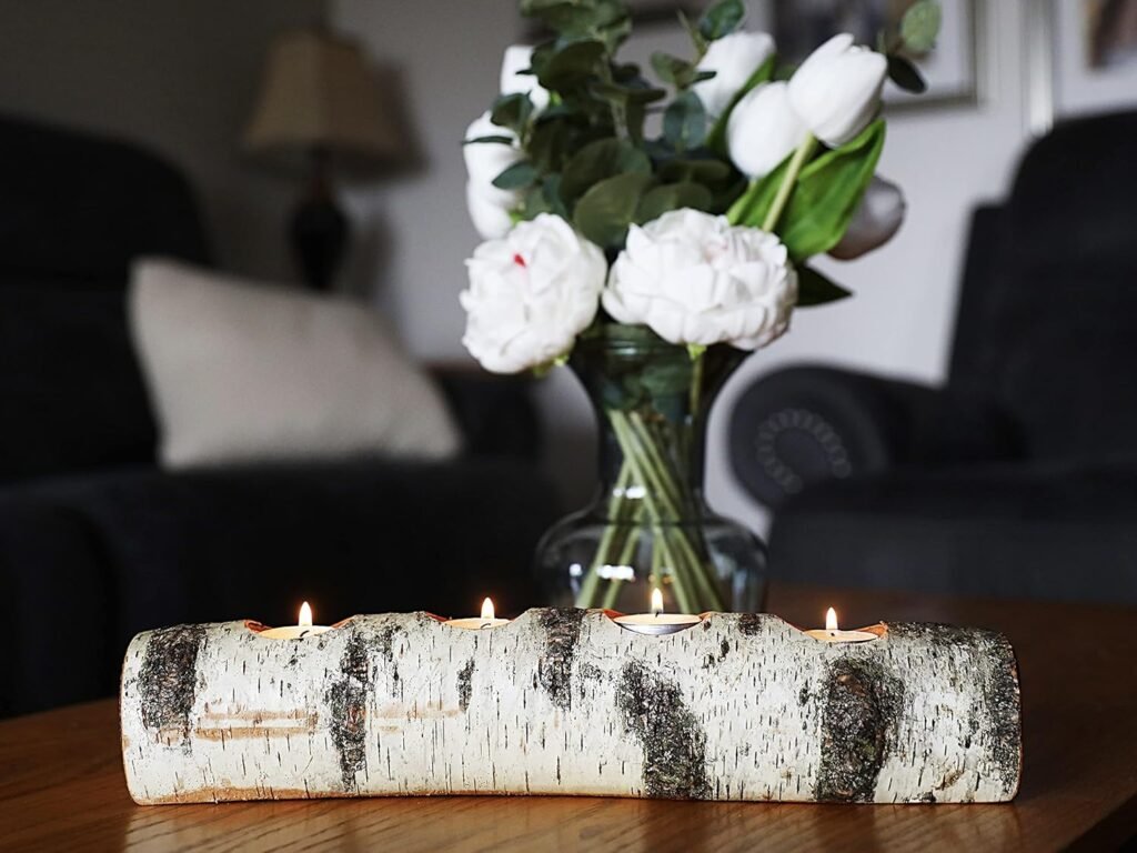 Full Log Birch Wood Branch Candle Holder in White Birch Bark